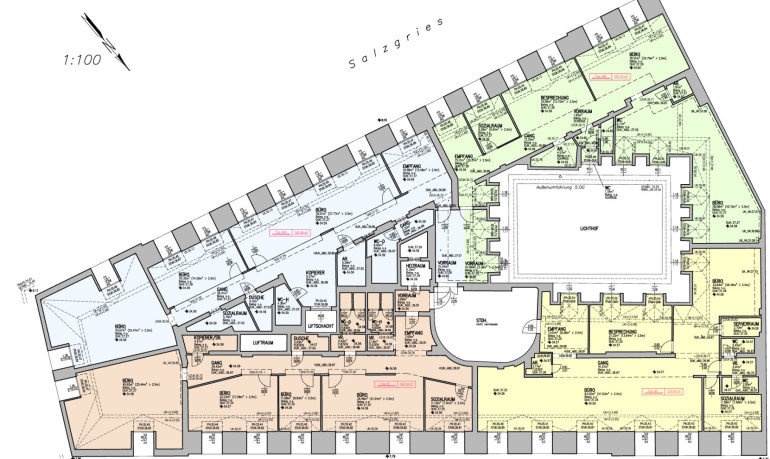 Beim Betreten des Büros steht man direkt im ca. 21 m² großen Vorraum, dieser mit dem angrenzenden Büro geteilt ist. Beim Eingang befindet sich der ca. 18 m² große Empfang. Durch einen ca. 33 m² langen Gang gelangt man zu den einzelnen Büroräumen. Auf der linken Seite des Ganges befindet sich ein Serverraum, ein Sozialraum mit einer Teeküche, die Toiletten für die Damen und Herren, ein Badezimmer, ein Kopierraum und ein Abstellraum. Die Fläche des Heizraumes wird auf vier Einheiten aufgeteilt.