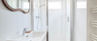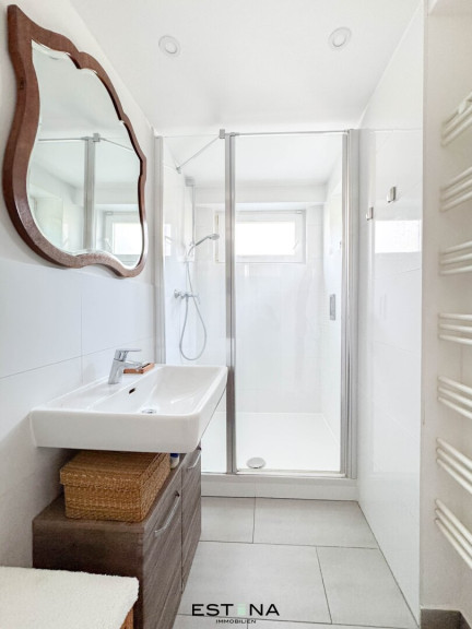 - Badezimmer mit Dusche, Waschbecken und Fenster