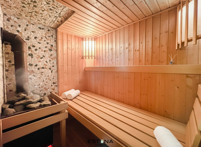 Parkett, Fliesen, Gas, Einbauküche, Bad mit Fenster, Dusche, Carport, Alarmanlage, Sauna