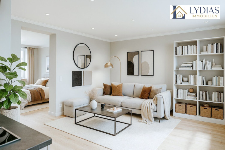 Zur Information: Die Abbildung des Wohnzimmers wurde virtuell gestaltet und dient der Veranschaulichung. Die Originalfotos finden Sie ebenfalls im Inserat