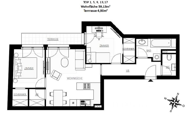 Je nach Wohnung stehen Balkone und/oder Terrassen mit Holzrosten und blickdichten Trennwänden zur Verfügung. Die Außenanlagen sind begrünt und mit einer ansprechenden Wegeführung sowie Beleuchtung ausgestattet.