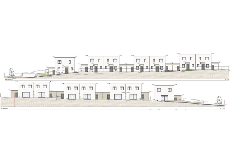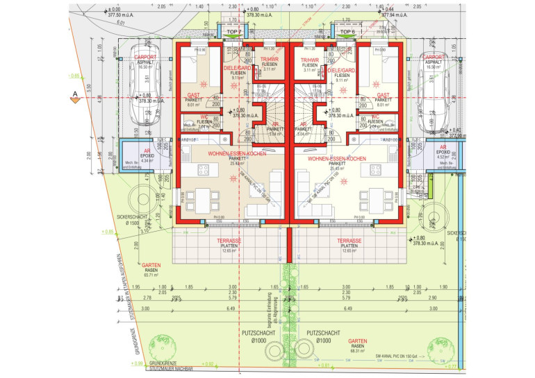 - Der Eingangsbereich, die Abtrennung zwischen den Terrassen, der Abstellraum beim Carport und das Carport werden in Beton ausgeführt.