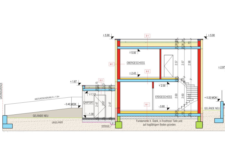 - Der Eingangsbereich, die Abtrennung zwischen den Terrassen, der Abstellraum beim Carport und das Carport werden in Beton ausgeführt.