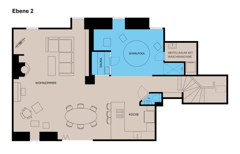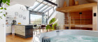 Direkt integriert ist der exklusive Spa-Bereich mit Whirlpool, Sauna und offener Dusche. Ob erholsames Schwitzen, Hydrotherapie im warmen Wasser oder ein Glas Wein auf dem ausklappbaren Balkon: Hier genießen Sie Wellness, ohne Ihr Zuhause verlassen zu müssen.