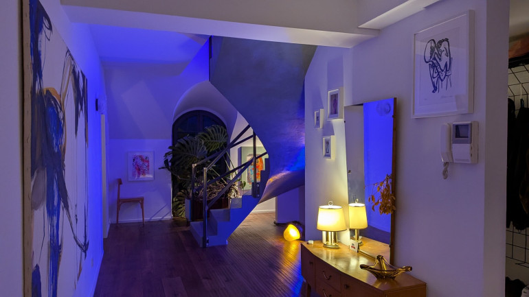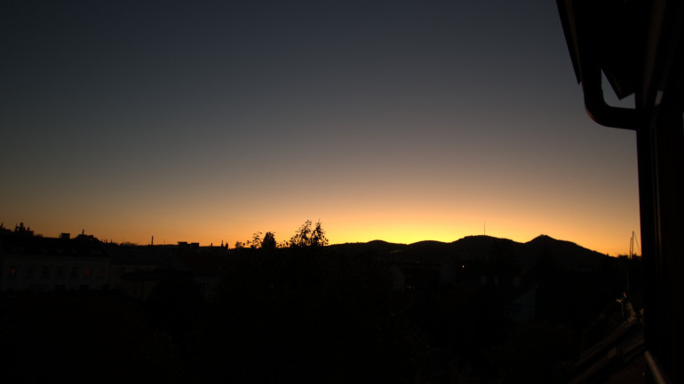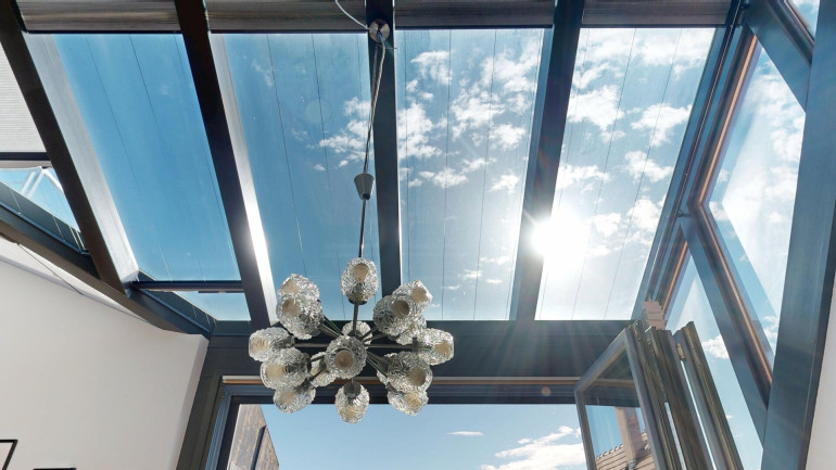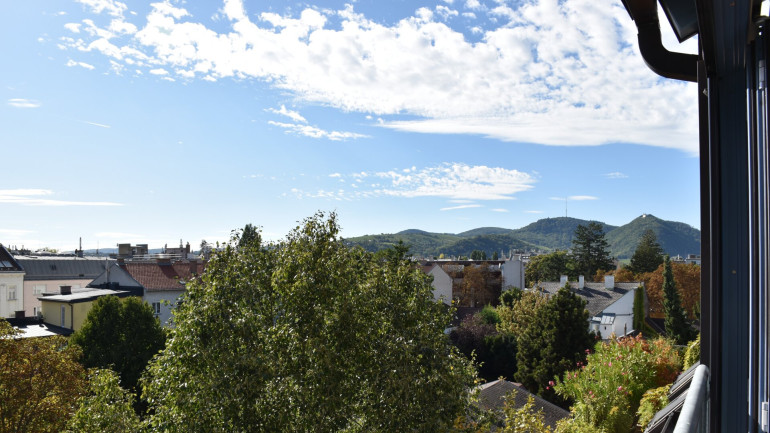 Das Highlight offenbart sich im Obergeschoss: ein offener Wohn-, Ess- und Küchenbereich mit Kamin, maßgefertigter Beton-Kücheninsel und angrenzendem Wintergarten, dessen Glasdach elektrisch beschattet werden kann. Von hier öffnet sich der Blick über die Dächer Wiens bis hin zu den Weinbergen – ein Panorama, das bei Sonnenuntergang unvergleichlich wirkt.