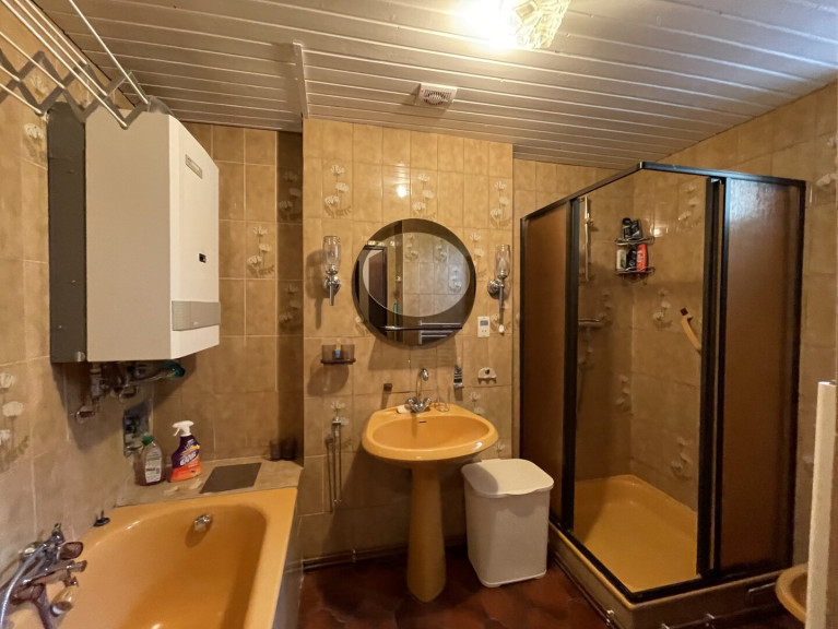 Insgesamt gibt es eine Terrasse, einen Garagenstellplatz, zwei WC's, zwei Bäder, zwei Küchen, einen Balkon und einen großen Garten.