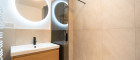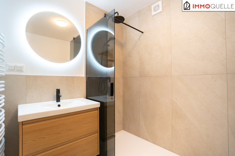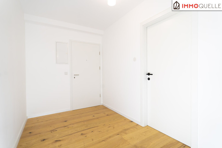 Schon beim Betreten fällt die klare Struktur der Wohnung ins Auge: Der zentrale Vorraum erschließt alle Räume und sorgt für kurze Wege im Alltag. Gleich rechts befindet sich ein elegantes Badezimmer mit begehbarer Dusche, Handtuchheizkörper und Waschmaschinenanschluss. Daneben ein separates WC – dezent positioniert für maximale Privatsphäre.