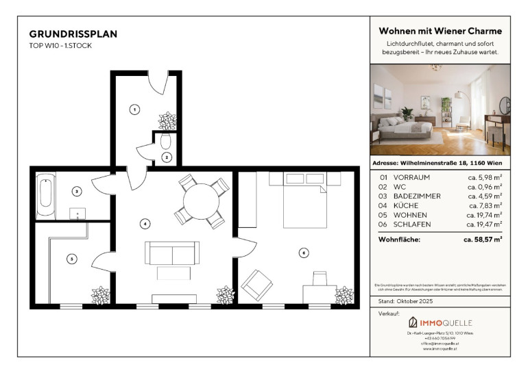 Willkommen in der Wattgasse – und in einer Wohnung, die Wiener Charme mit moderner Behaglichkeit verbindet. Im ersten Stock eines gepflegten Hauses öffnet sich diese rund 58 m² große 2-Zimmer-Wohnung zur südöstlichen Morgensonne – mit einem Grundriss, der durchdacht, wohnlich und effizient zugleich ist.