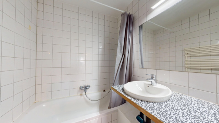 Badezimmer mit Badewanne, Handtuchtrockner und Waschmaschinenanschluss