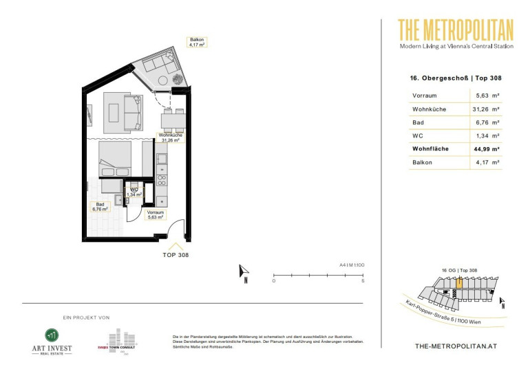 Hippe Cafés, coole Bars und jede Menge Unbeschwertheit: The Metropolitan liegt an der schillernden Vienna Central Station zwischen dem modernen Quartier Belvedere und dem grünen Sonnwendviertel. Hier können Sie abseits des Mainstreams der Stadt abhängen und originelle Shops, Lokale, Kunst- und Kulturangebote sowie Frischluft in grünen Parkanlagen vor der Haustüre genießen. Zahlreiche attraktive Plätze laden zum Verweilen, Bewegen und Staunen ein. In nur wenigen Schritten sind die Bezirke Wieden, Landstraße und das historische City Center erreichbar. Ob Tennis im Arsenal, zeitgenössische Kunst im Belvedere 21 oder ein Cocktail auf der Rooftop-Bar gegenüber – in der Karl-Popper-Straße 5 kann man eins werden mit dem pulsierenden Stadtleben und zwischendurch Ruhe in den benachbarten und üppig grünen Parks finden. Alles ist möglich – an diesem einmaligen Standort.