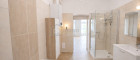 Badezimmer mit einer Badewanne und einer Dusche. Perfekt für entspannende Wellnessmomente!