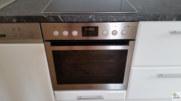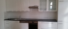 Rechts vom Vorraum gelangt man in das neu verflieste WC mit Zentralheizung und Handwaschbecken sowie in die Küche. Diese besticht durch einen weißen Lackverbau mit schwarzer Arbeitsplatte sowie einen Herd mit Ceranfeld, Dunstabzug, einen Geschirrspüler, einen Einbaukühlschrank und eine Nirosta-Spüle.