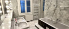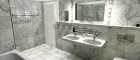 Links vom Vorraum gelangt man über einen weiteren kleinen Vorraum (ca. 2 m²) in das Bad, welches mit einer Dusche und einer Badewanne sowie einem Doppelwaschbecken ausgestattet ist und weiter in ein Kabinett mit Gangfenster.