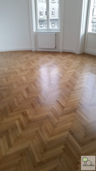Vom ca. 13 m² großen Vorraum gelangt man in die 3 Hauptzimmer der Wohnung (diese sind in etwa gleich groß: 2 Zimmer haben ca. 25 m² und 1 Zimmer hat knapp 20 m² Wohnfläche). Der neu versiegelte Parkettboden spiegelt das Licht durch die großen, neuen Fenster.
