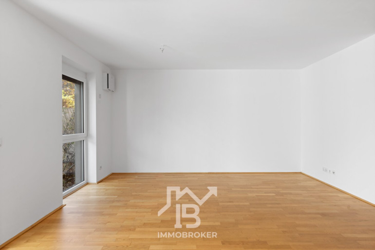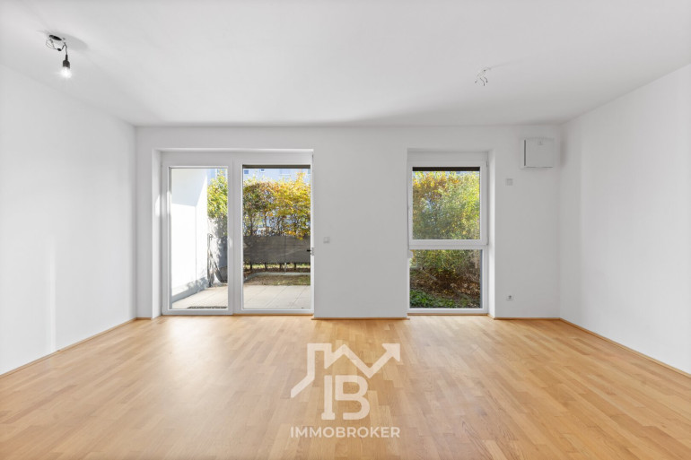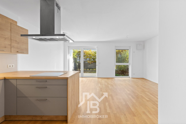 Die Wohnung mit ca. 75,33 m² Nutzfläche (inkl. 6,52m² Loggia) besticht durch ihren großzügigen Grundriss, der deutlich mehr Raumgefühl bietet als klassische 2-Zimmer-Wohnungen. Der offene Wohn-Essbereich mit Einbauküche (ca. 32,46 m²) bildet das Herzstück der Wohnung. Von hier aus gelangt man direkt auf die überdachte Loggia und in den sonnigen Eigengarten mit ca. 17 m², der viel Privatsphäre bietet – perfekt zum Entspannen oder für kleine Gartenprojekte.