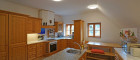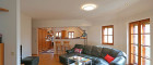 Großzügiger Wohn- und Essbereich mit offener Vollholzküche (Markengeräte)