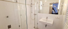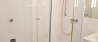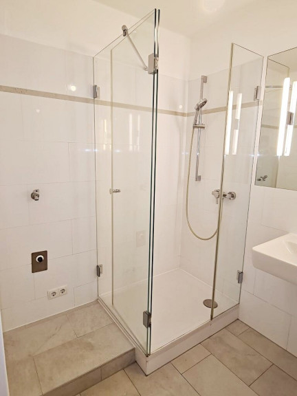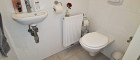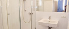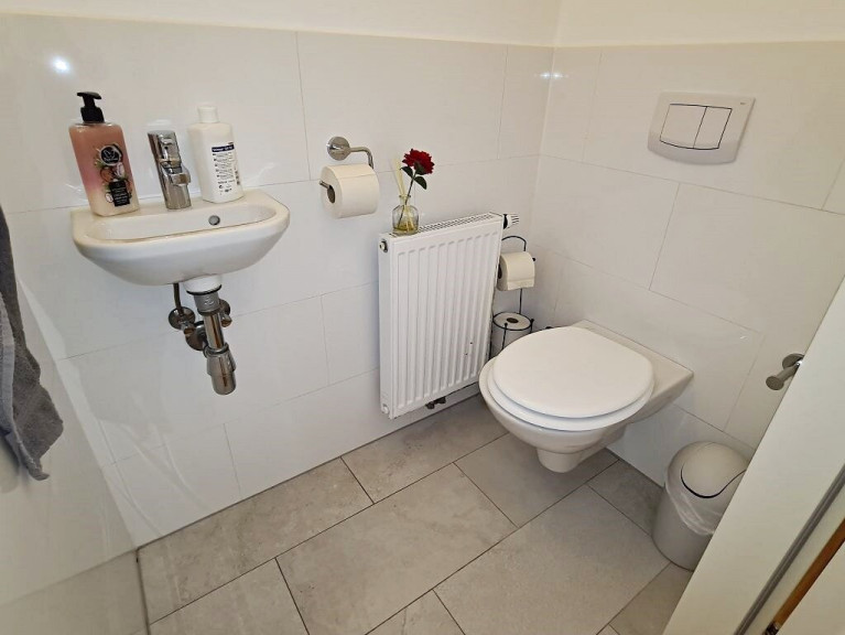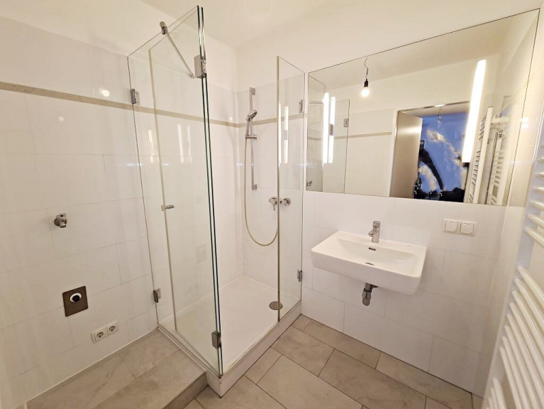 + Badezimmer mit Dusche, Waschtisch, Waschmaschinenanschluss und Sprossenheizkörper