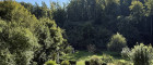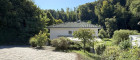 Bäume und Hecken rahmen das Grundstück wie eine grüne Kulisse, und am Rand plätschert ein kleines Bächlein, hinter dem der Wald beginnt – als würde die Natur hier leise applaudieren.