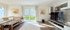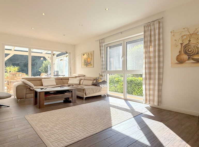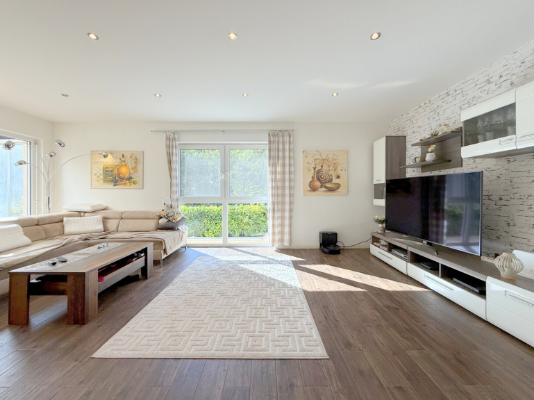 Das Wohnzimmer – großzügig, hell, mit feinem Boden im Holzdesign und Wänden in dezenter Steinoptik – trägt den Charakter eines Sommerabends in sich: ruhig, offen, elegant.