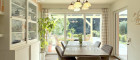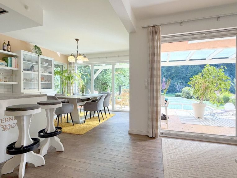 Der Essplatz liegt direkt an der Glasfront – mit Blick ins Grün, wo das Blau des Pools schon verheißungsvoll glitzert.