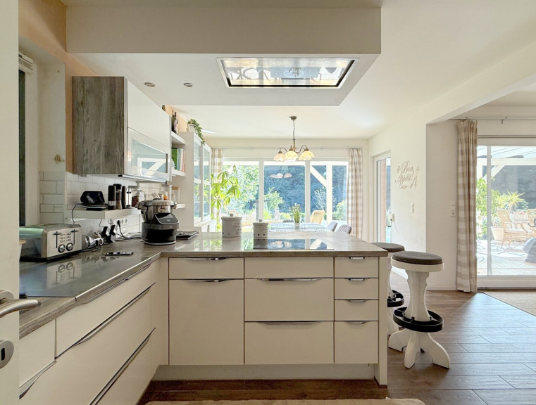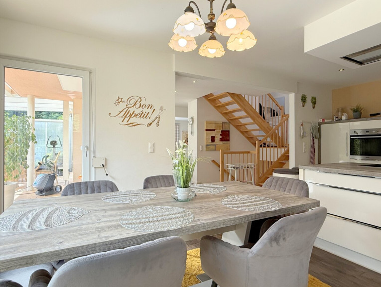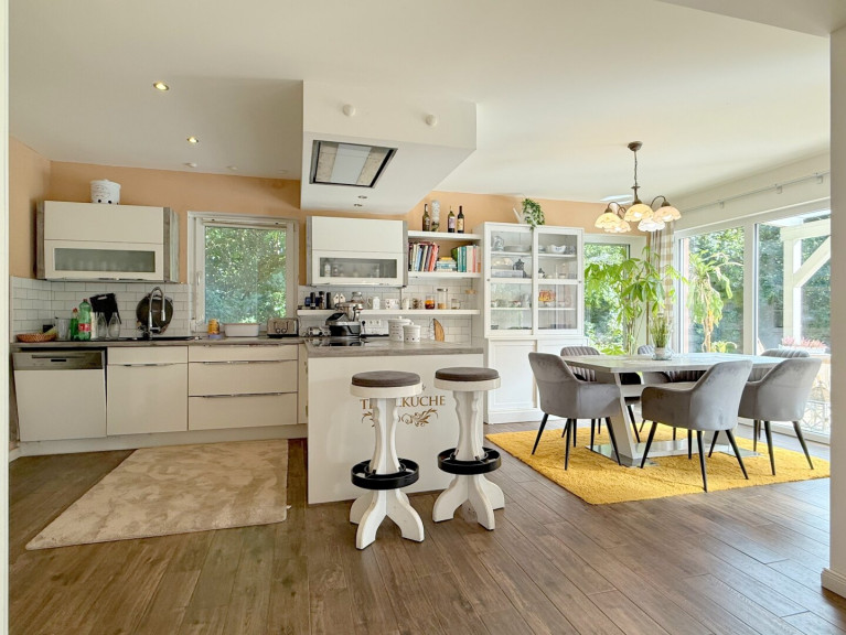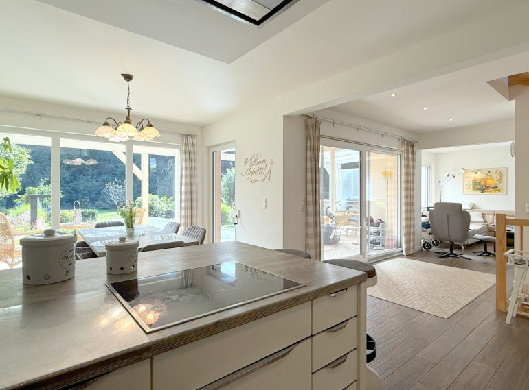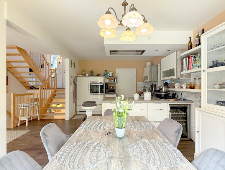 Im Erdgeschoss verschmilzt die offene Küche mit dem Essbereich und bildet damit das Herzstück des Hauses – dort, wo Genuss und Geselligkeit Hand in Hand gehen.