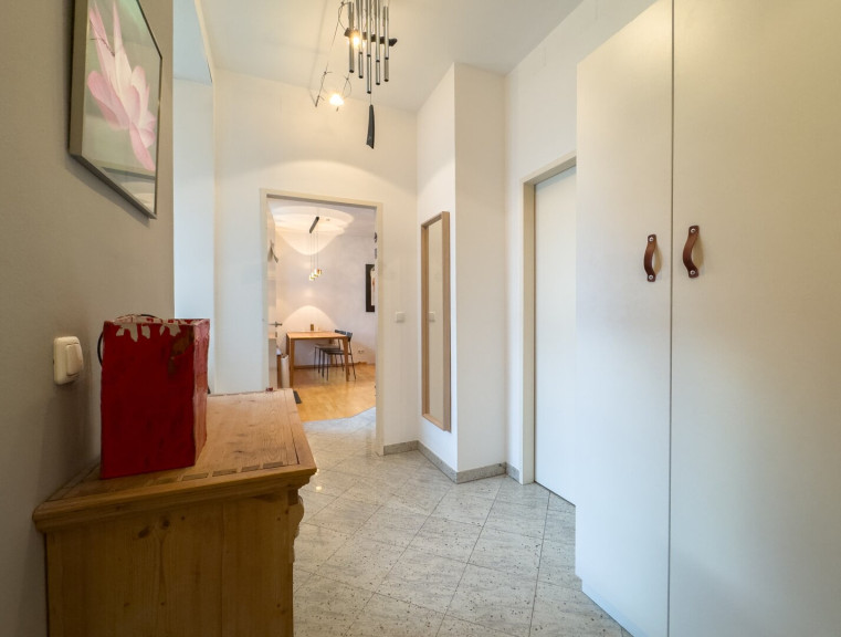 Das großzügige Vorzimmer führt - neben dem Badezimmer mit Dusche und dem separaten WC - auf direktem Weg in das lichtdurchflutete Wohnzimmer mit offener Wohnküche. Diese ist voll ausgestattet und verfügt über einen praktischen Abstellraum. Die Fenster sind allesamt nach Süden ausgerichtet und sorgen damit für ein sonniges Ambiente. Ein kleiner Zwischenflur, der Stauraum bietet, führt in die beiden Zimmer, eines davon wird momentan als Schlafzimmer, das andere als Arbeitszimmer genutzt.