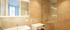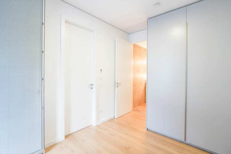 Das separat gelegene Schlafzimmer bietet ausreichend Platz für ein komfortables Doppelbett und verfügt über einen maßgefertigten Einbauschrank in High-End-Qualität. Im Vorzimmer befindet sich ein moderner, bis zur Decke reichender Garderoben-Wandschrank-Verbau, der neben einer ansprechenden Optik auch großzügigen, zusätzlichen Stauraum bietet und das exklusive Ambiente der Wohnung unterstreicht. Das Bad ist mit einer eleganten Walk-In-Dusche, Design-Handtuchtrockner und hochwertigen Feinsteinzeug fliesen ausgestattet.