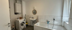 Beim Betreten werden Sie von einem einladenden Flur begrüßt, der rechterhand zu einem separaten WC mit Handwaschbecken führt. Nur wenige Schritte weiter, ebenfalls auf der rechten Seite, befindet sich das geräumige Badezimmer mit einer großzügigen Badewanne, einer Dusche, einem stilvollen Waschbecken, einem weiteren WC und einem praktischen Waschmaschinenanschluss.
