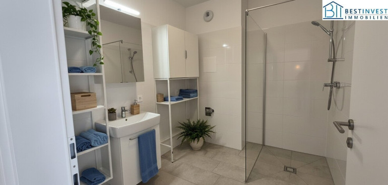 - große Dusche 120 x 90 mit Glaswand, Waschtisch und Spiegelschrank