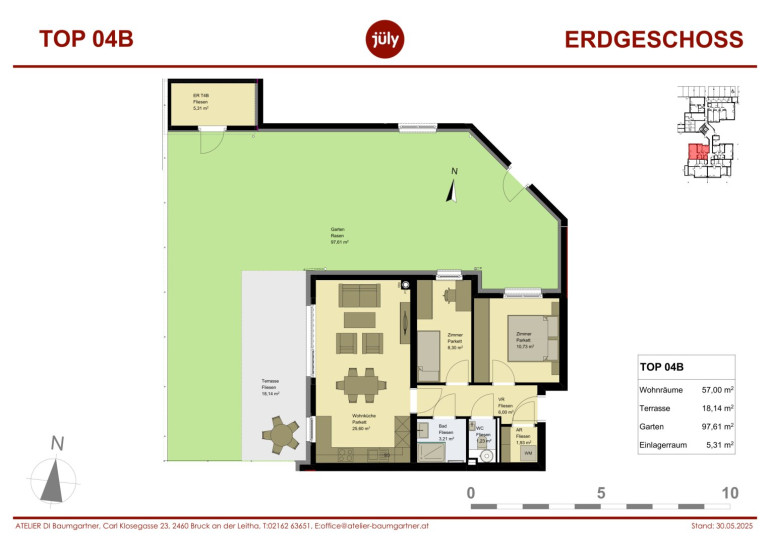 Alle Wohnungen bieten neben dem offenen Wohn-Esszimmer mit intergirierter Küche 2-3 Schlafzimmer und großzügige Terrassen mit 16 - 58 m². Die Erdgeschosswohnungen verfügen zusätzlich über eigene Gärten. So entsteht viel Raum für Ruhe, Erholung und Lebensqualität – drinnen wie draußen. Alle Wohnungen und Nebenräume sind stufenlos im Erdgeschoss bzw. mit dem Lift erreichbar. In der Gesamtmiete inkludiert sind bei jeder Wohnung 2 Parkplätze.
