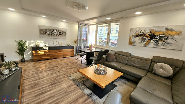 Beim Betreten der Wohnung gelangt man in einen geräumigen Vorraum, von dem aus alle Räume zentral begehbar sind. Auf der linken Seite befinden sich das Badezimmer, die separate Toilette sowie der praktische Abstellraum. Geradeaus gelangt man in das Wohnzimmer und ein Schlafzimmer. Auf der rechten Seite befinden sich zwei weitere Zimmer, die flexibel als Schlaf- oder Arbeitszimmer genutzt werden können, sowie die Küche mit voll ausgestatteter Einbauküche.