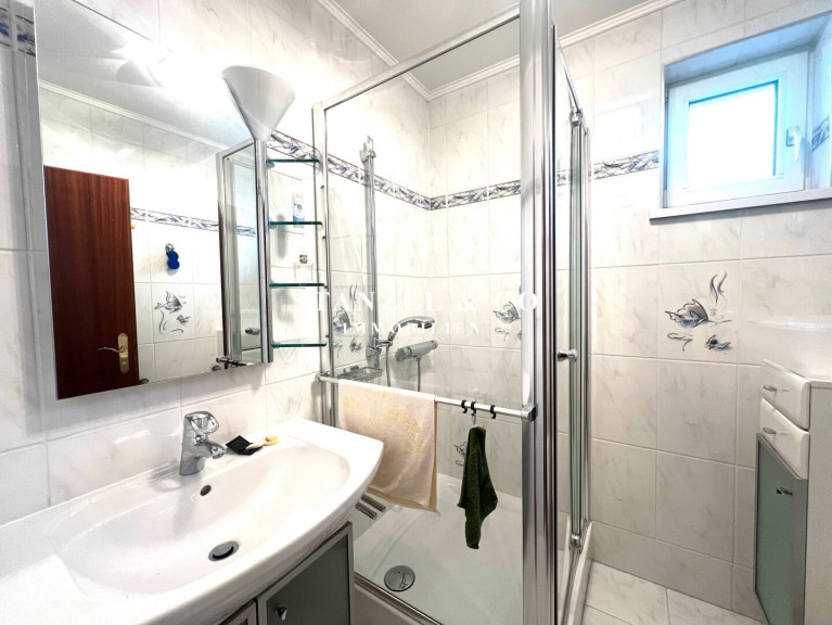 Das Badezimmer ist mit einer Dusche, einem Waschtisch mit Unterschrank, Spiegelschrank und Fenster ausgestattet. Des Weiteren gibt es ein separates WC mit einem Fenster.