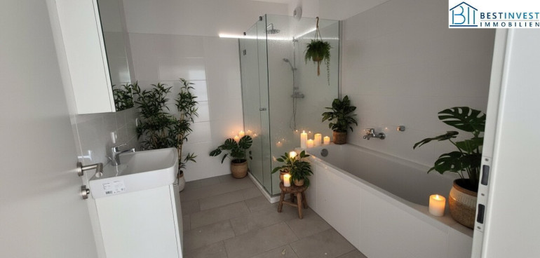 - Badewanne und zusätzlich große Dusche 90 x 90 mit Glaswand, Waschtisch und Spiegelschrank.