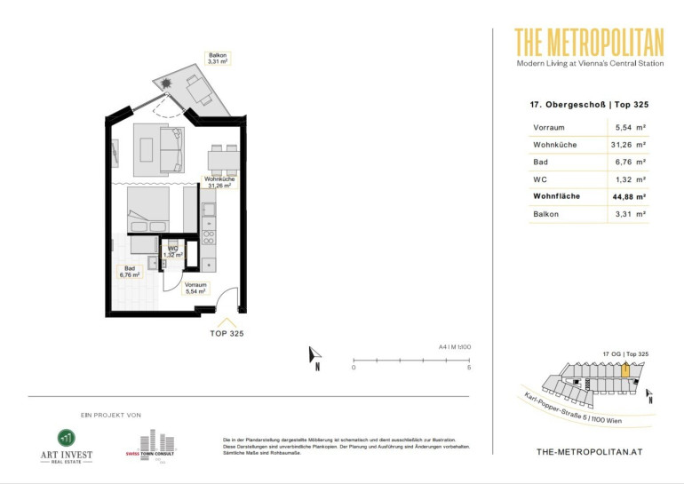 Hippe Cafés, coole Bars und jede Menge Unbeschwertheit: The Metropolitan liegt an der schillernden Vienna Central Station zwischen dem modernen Quartier Belvedere und dem grünen Sonnwendviertel. Hier können Sie abseits des Mainstreams der Stadt abhängen und originelle Shops, Lokale, Kunst- und Kulturangebote sowie Frischluft in grünen Parkanlagen vor der Haustüre genießen. Zahlreiche attraktive Plätze laden zum Verweilen, Bewegen und Staunen ein. In nur wenigen Schritten sind die Bezirke Wieden, Landstraße und das historische City Center erreichbar. Ob Tennis im Arsenal, zeitgenössische Kunst im Belvedere 21 oder ein Cocktail auf der Rooftop-Bar gegenüber – in der Karl-Popper-Straße 5 kann man eins werden mit dem pulsierenden Stadtleben und zwischendurch Ruhe in den benachbarten und üppig grünen Parks finden. Alles ist möglich – an diesem einmaligen Standort.