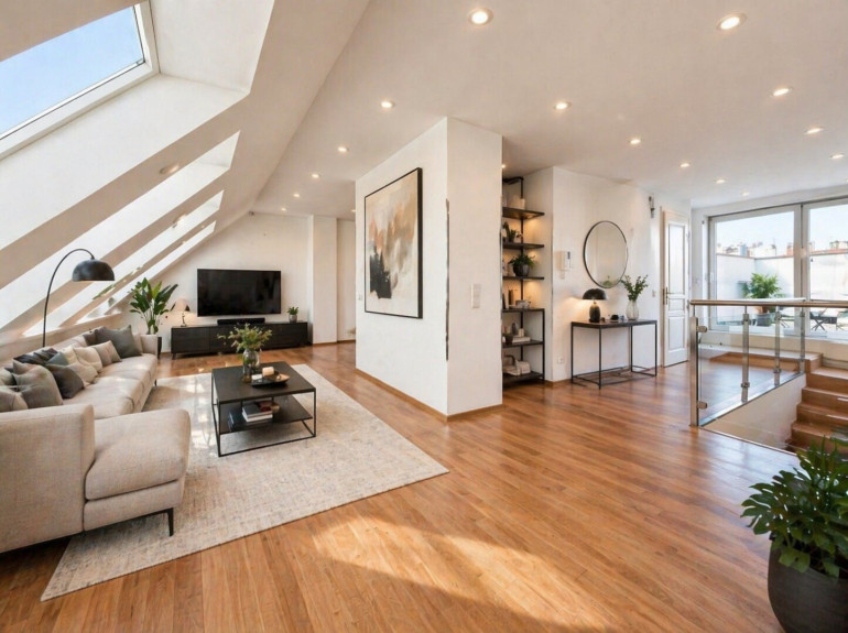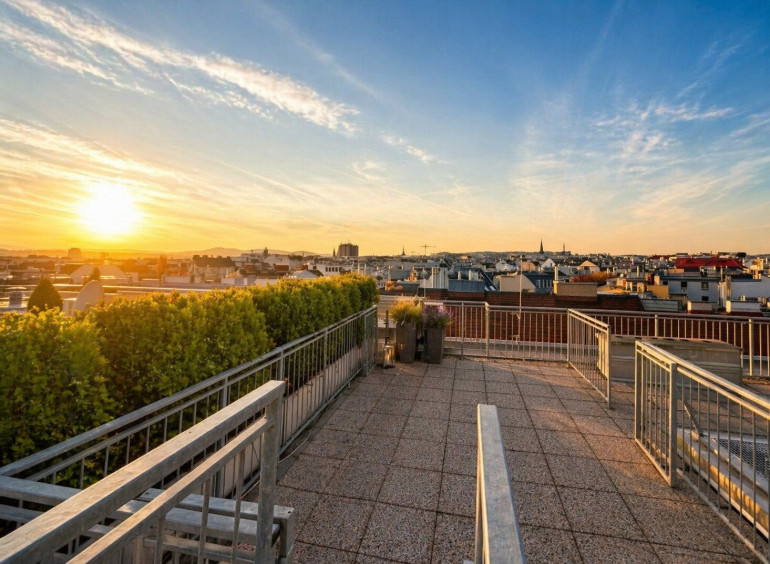 Die rund 100 m² große Terrasse mit Outdoor-Dusche bildet das absolute Highlight. Mit einem beeindruckenden Ausblick über die Dächer Wiens bietet sie eine private Oase mitten in der Stadt – perfekt für entspannte Stunden im Freien oder stilvolle Abende. Die großzügige Außenfläche eröffnet zahlreiche Gestaltungsmöglichkeiten: Ob Sauna, Whirlpool, Outdoor-Küche mit Grillstation oder ein grünes Stadtrefugium – hier bleiben keine Wünsche offen.