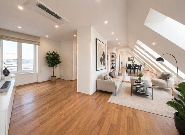 Diese außergewöhnliche, lichtdurchflutete Dachgeschosswohnung besticht durch ihre großzügige Raumaufteilung, ihren besonderen Wohncharakter und die äußerst zentrale Lage. Auf der unteren Ebene erwarten Sie vier geräumige Schlafzimmer, zwei separat begehbare Badezimmer, zwei WCs, eine praktische Waschküche sowie ein Abstellraum. Die optimal geschnittenen Zimmer bieten viel Tageslicht und schaffen eine warme, einladende Wohnatmosphäre.