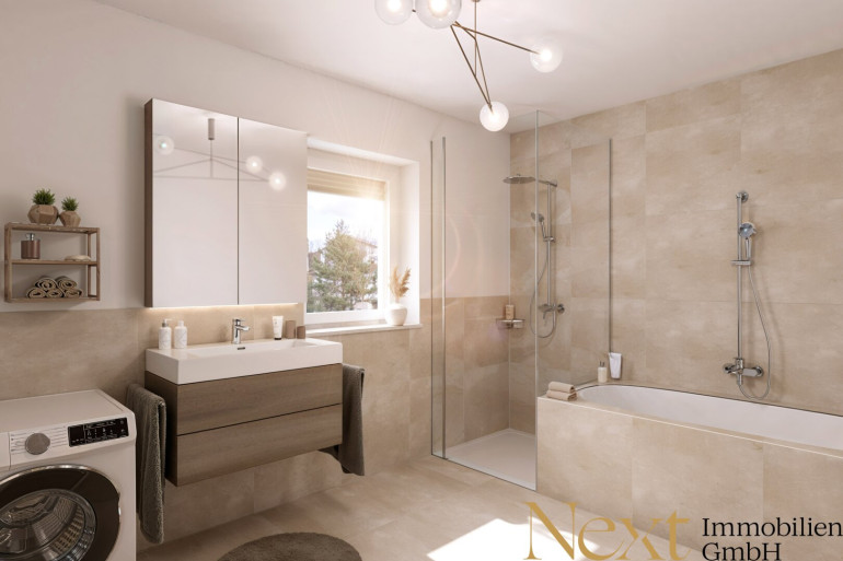 - Badezimmer mit Badewanne & Dusche, Waschbecken, Waschmaschinenanschluss