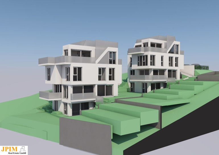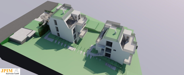 Die Baugenhmigung beinhaltet 2 Gebäude (obere Geschosse mit Aussicht) mit jeweils 2 großen Maisonettwohnungen (mit jeweils einem großen offenen und sonnige Küchenwohnraum und 4 Schlafzimmern) mit Terrassen, Balkonen, Gärten und Stellplatzen und 2 KFZ-Stellplätze. Die Wohnnutzfläche inkl. Balkone und Terrassen beträgt 686m² und die dazugehörenden Garten und KfZ-Stellplätze ca. 140m². Der Baumbescheid liegt vor.