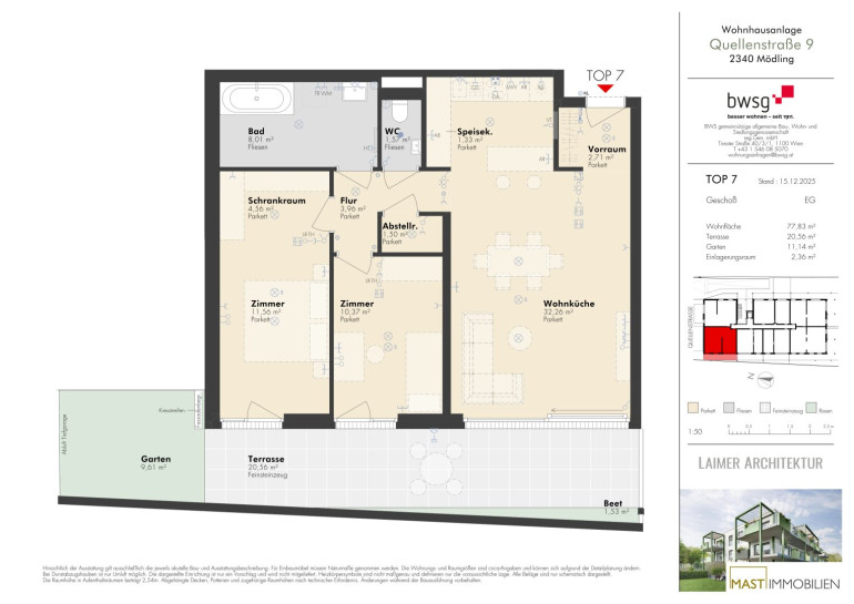 Die Wohnung befindet sich im Erdgeschoss und verfügt über 77,83 m² Wohnfläche + eine 20,56 m² große Terrasse und einen 11,14 m² großen Garten.