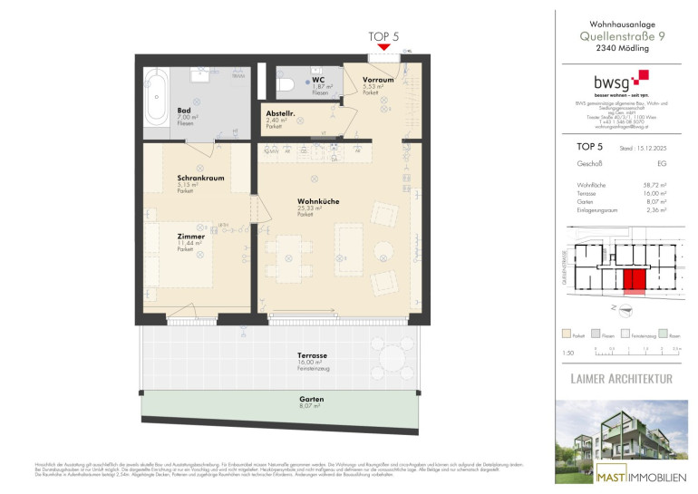Die Wohnung befindet sich im Erdgeschoss und verfügt über 58,72 m² Wohnfläche + eine 16,00 m² große Terrasse und einen 8,07 m² großen Garten.