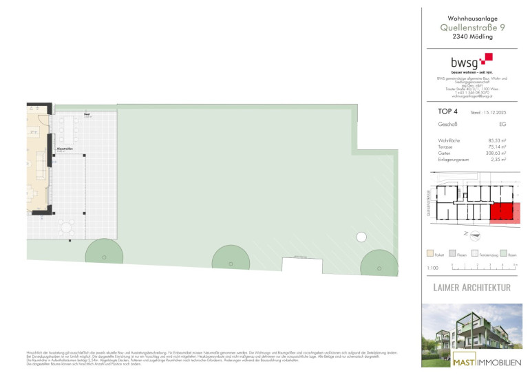 Die Wohnung befindet sich im Erdgeschoss und verfügt über 85,53 m² Wohnfläche + eine 75,14 m² große Terrasse und einen 308,63 m² großen Garten.