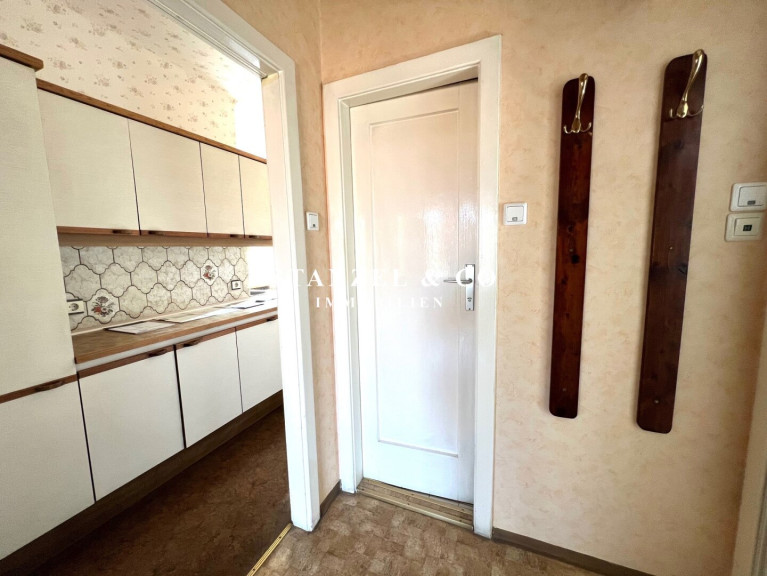 Die ca. 8m² große Wohnküche ist ausgestattet ( schon älter, es wird keine Garantie für die Funktionsfähigkeit der Geräte übernommen ) und hat ein Fenster,