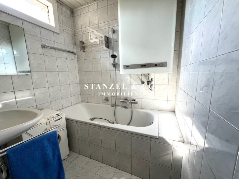 Das terrassenseitige Schlafzimmer ist ca. 15m² groß. Das ca. 3m² große Badezimmer ist mit einer Wanne und einem Waschbecken ausgestattet, es hat ein Fenster.