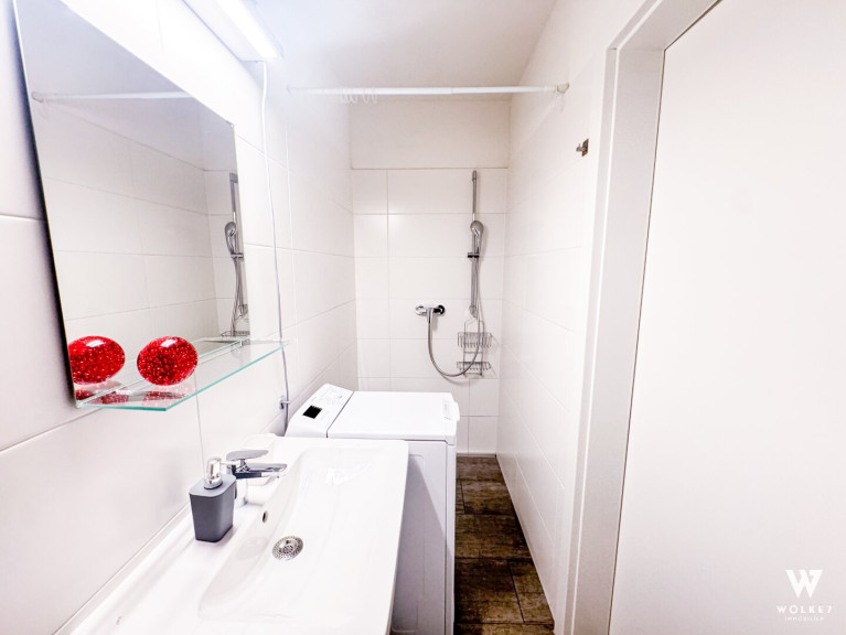 Das modern gestaltete Badezimmer ist mit Dusche und WC funktional ausgestattet. Ergänzend steht ein ca. 1 m² großes Kellerabteil zur Verfügung, das zusätzlichen Stauraum bietet.