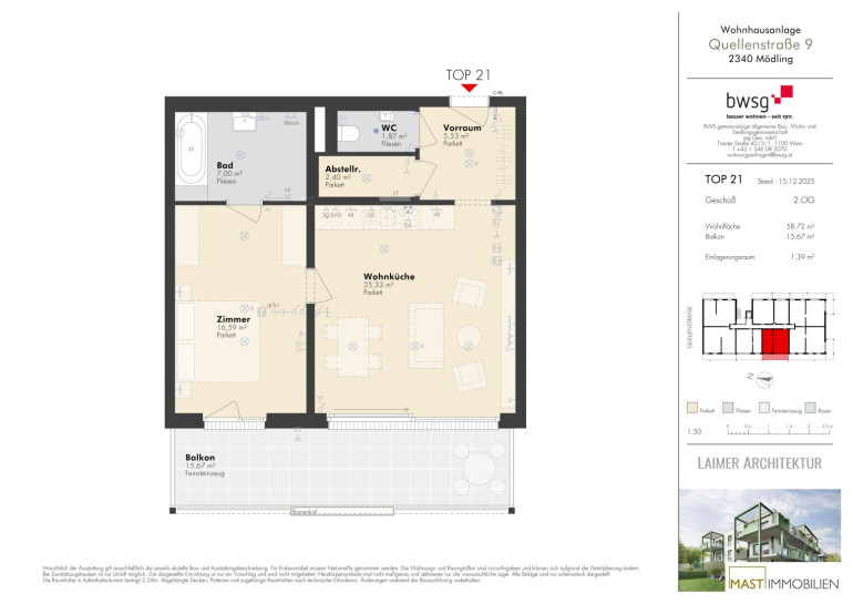 Die Wohnung befindet sich im 2. Obergeschoss (Dachgeschoss) und verfügt über 58,72 m² Wohnfläche + einen 15,67 m² großen Balkon.