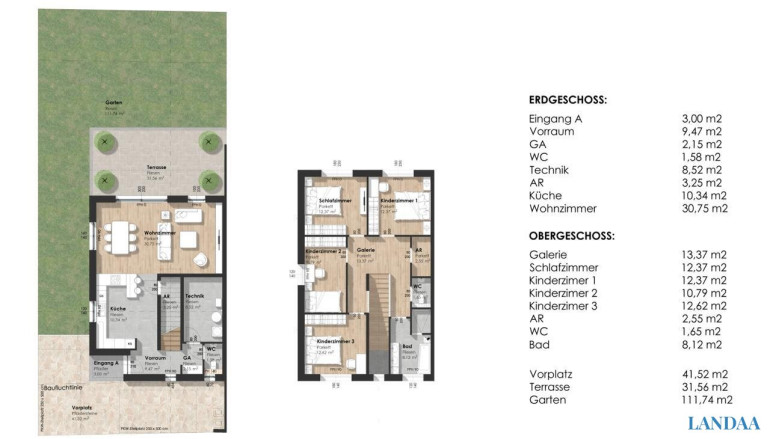 Haus A: Wohnrläche 139,34 m², Vorplatz 40,46 m², Terrasse 31,56 m², Garten 111,74 m², 2 Stellplätze (jeweils EUR 15.000,-)