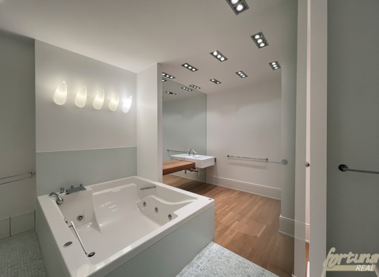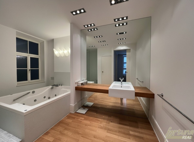 • großem Badezimmer mit Whirlpool, Walk-in-Dusche, elegantem, modernen Waschtisch und Fenster (Der Einbau eines zweiten WCs ist möglich);