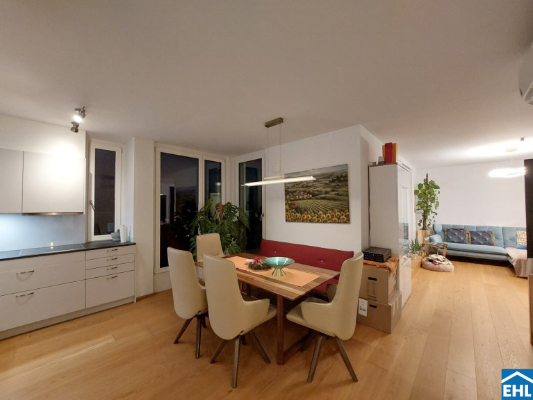 Die großzügige Wohnung selbst befindet sich im 1. Dachgeschoss, überzeugt durch ihre lichtdurchfluteten Räume, verfügt über eine großzügige, helle Wohnküche mit vollausgestatteter Einbauküche, drei ruhige separat begehbare Schlafzimmer, ein Badezimmer mit Dusche und Waschmaschinenanschluss und Doppelwaschbecken, ein separates WC sowie einen Vorraum. In jemdem Zimemr befindet sich ein Klimagerät. Die Terrassen mit zusammen 49 m² runden das Wohnerlebnis perfekt ab.