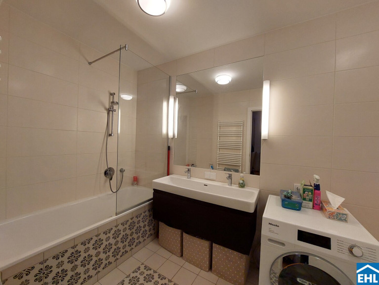 - modernes Bad mit Wanne, Handwaschbecken, WC und Waschmaschinenanschluss