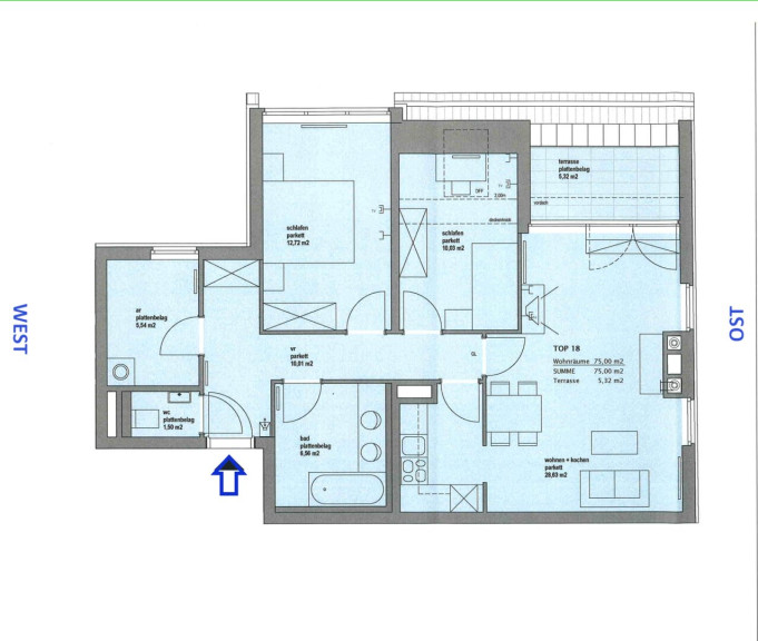 ( Vorzimmer, Terrasse, Wohnesszimmer mit offener Küche, 2 Schlafzimmer, Badezimmer, Abstellraum, WC & Kellerabteil )